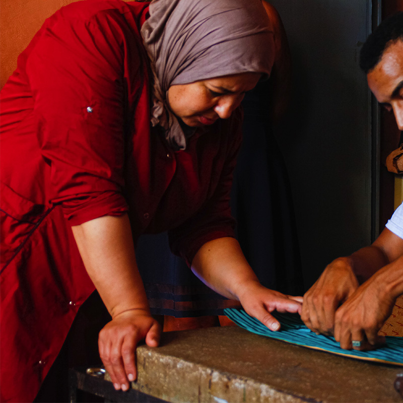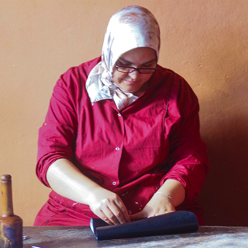 Joining forces with Rkiya when she had to provide, Souad is full of smiles and laughter as she pioneers the leather working industry. A chance meeting and a true friendship lead her and Rkiya to being the only female run artisan leather shop in Marrakech.